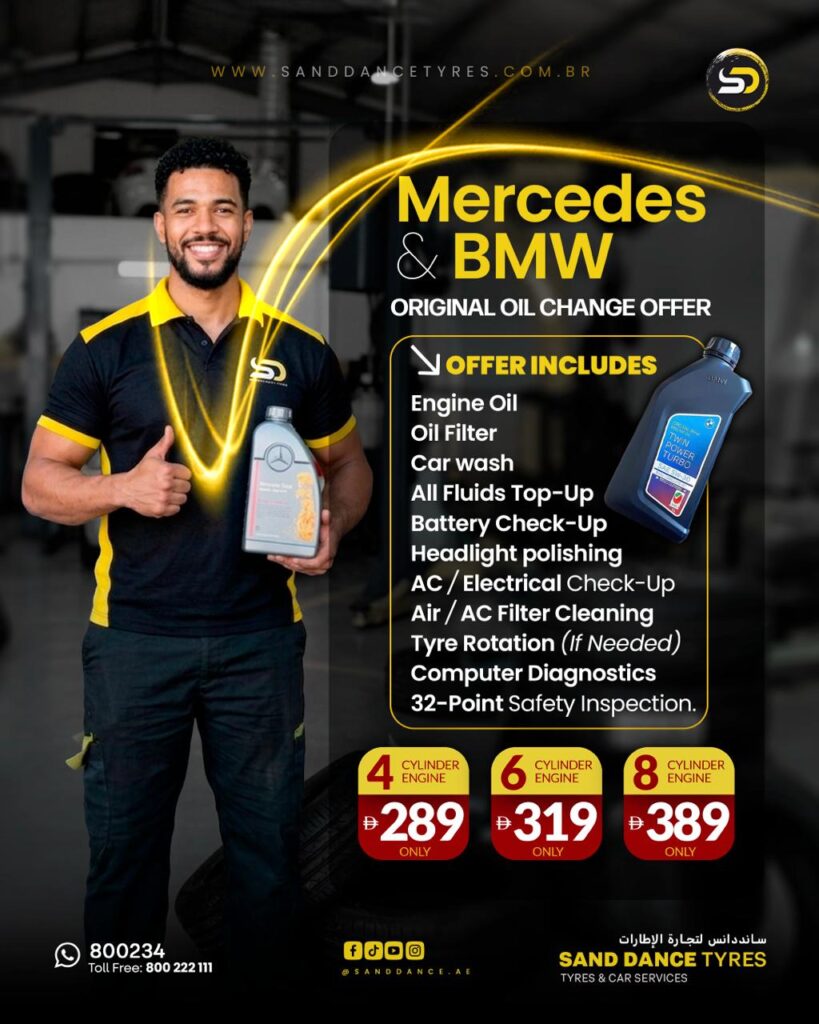 While your vehicle is in the workshop, it’s the perfect time to check your tyres and wheels. Many full-service packages in the UAE now include a complimentary tyre pressure check and visual rim inspection. If you’re looking to upgrade or replace, you can easily buy SandDance tyre online Dubai — a reliable way to source quality rubber from the comfort of your home. Alternatively, if you’re exploring options like Dunlop tyres in UAE, many authorized dealers stock the complete Dunlop range suited for both Mercedes and BMW fitments. And if your alloys have seen better days, a professional rim repair service can restore them to factory condition without the need for full replacement.